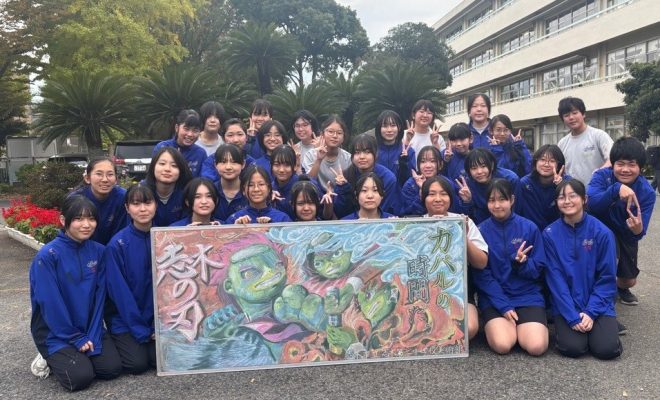 制作には、2年生18人・1年生17人の計35人が参加し、色の重ね方やグラデーション、立体感の出し方など、チョーク技法を一つずつ学びながら協力して進めました。意見を出し合い、細部まで丁寧に仕上げた力作です。ぜひご覧ください。